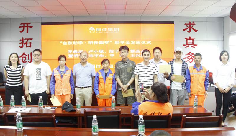 8月28日上午,明佳集團工會(huì )“金秋助學(xué)·明佳圓夢(mèng)”助學(xué)金發(fā)放儀式在集團公司三樓會(huì )議室舉行,為8個(gè)考取大學(xué)的職工子女發(fā)放助學(xué)金共計9600元??偛藐愒?、副總經(jīng)理鐘寒參加發(fā)放儀式,儀式由工會(huì )主席高斐斐主持。