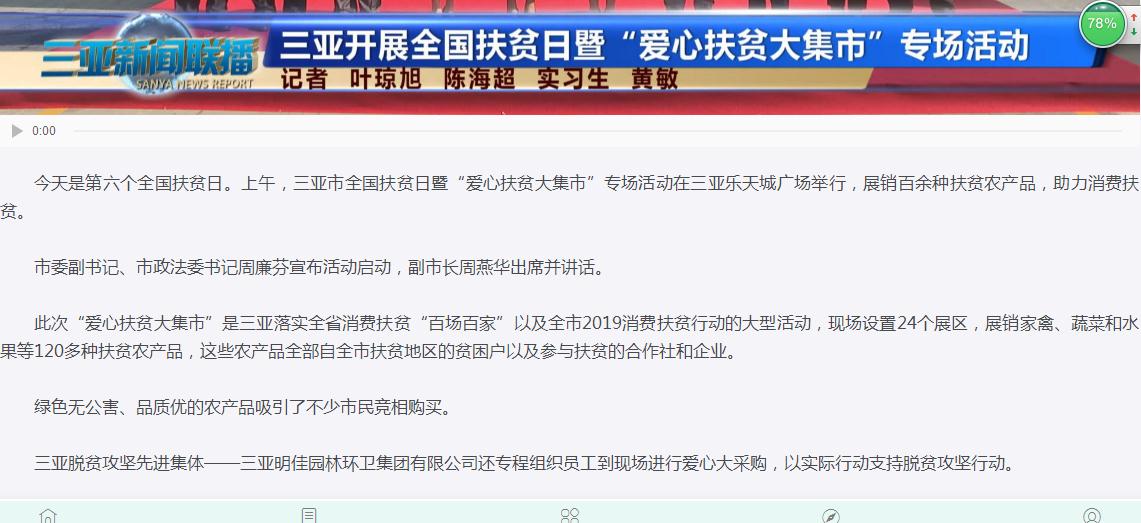 明佳集團作為三亞的本土企業(yè),主動(dòng)扛起扶貧擔當,投身扶貧事業(yè),積極回報社會(huì )。在此次大采購活動(dòng)中,集團員工在總裁陳云的帶領(lǐng)下,購買(mǎi)了4萬(wàn)個(gè)雞蛋、玉米5大袋,還有一些雞、牛肉等農副產(chǎn)品,合計金額約72600元。三亞日報和三亞新聞聯(lián)播分別對明佳集團的愛(ài)心大采購活動(dòng)進(jìn)行了報道。