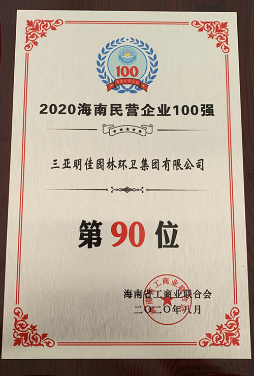 8月28日,“2020海南民營(yíng)企業(yè)百強發(fā)布會(huì )”在?谂e行。三亞明佳園林環(huán)衛集團有限公司再次入選“海南民營(yíng)企業(yè)100強”榜單,名列第90位。